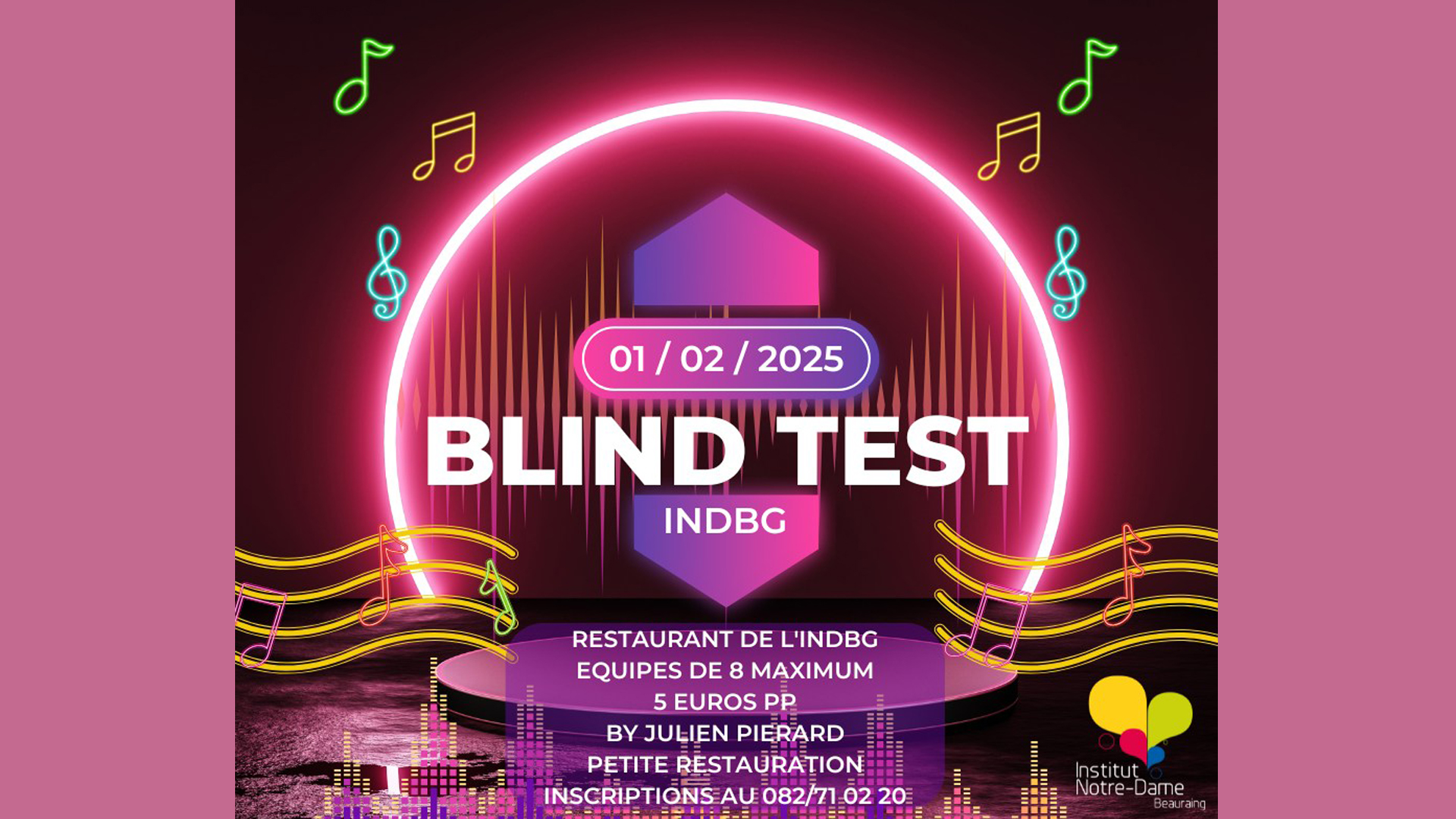 L’école INDBG vous invite à son Blind Test le samedi 1er février 2025 ! Venez tester vos connaissances musicales dans une ambiance festive et conviviale. 🎉 Formez votre équipe, chauffez vos cordes vocales, et soyez prêts à relever le défi ! En participant, vous soutenez une belle cause puisque tous les fonds récoltés serviront à financer le voyage de fin d’année des élèves.