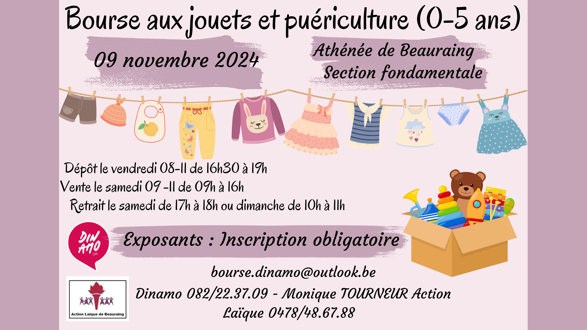 Vous cherchez des jouets de qualité pour préparer les fêtes ou des articles de puériculture à prix abordable ? Venez à la grande Bourse aux jouets et puériculture le samedi 15 novembre de 9h à 16h à l’Athénée de Beauraing (section fondamentale). Une occasion parfaite pour faire de bonnes affaires et dénicher de véritables trésors pour les petits !