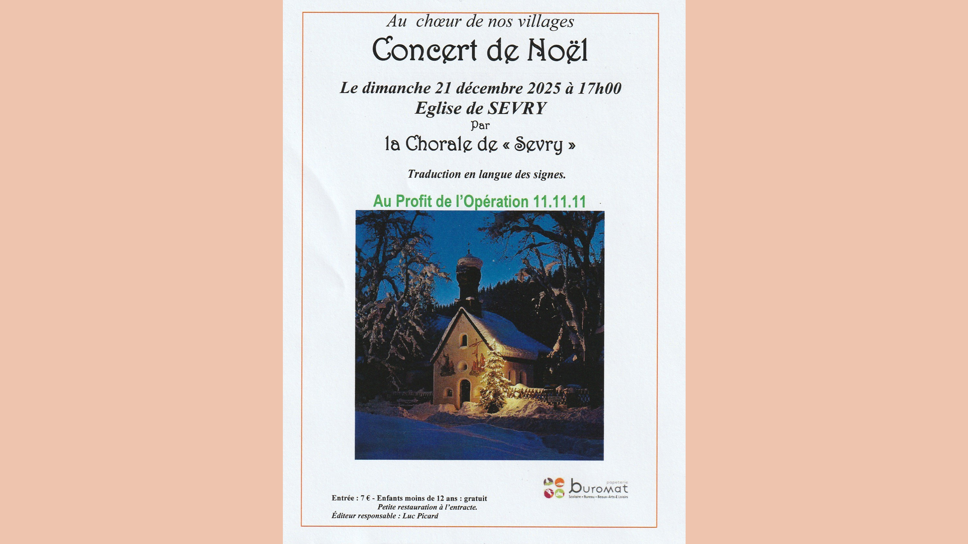 Le dimanche 21 décembre 2025 à 17h00, un concert de Noël sera donné à l’église de Sevry par la Chorale de Sevry.