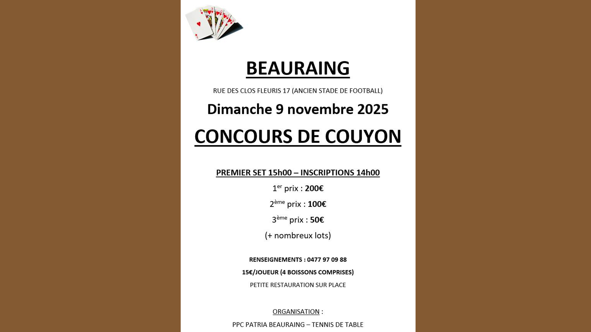 Le PPC Patria Beauraing (tennis de table) vous invite à son concours de couyon organisé le dimanche 09 novembre à l’ancien stade de football (Rue des Clos Fleuris 17).