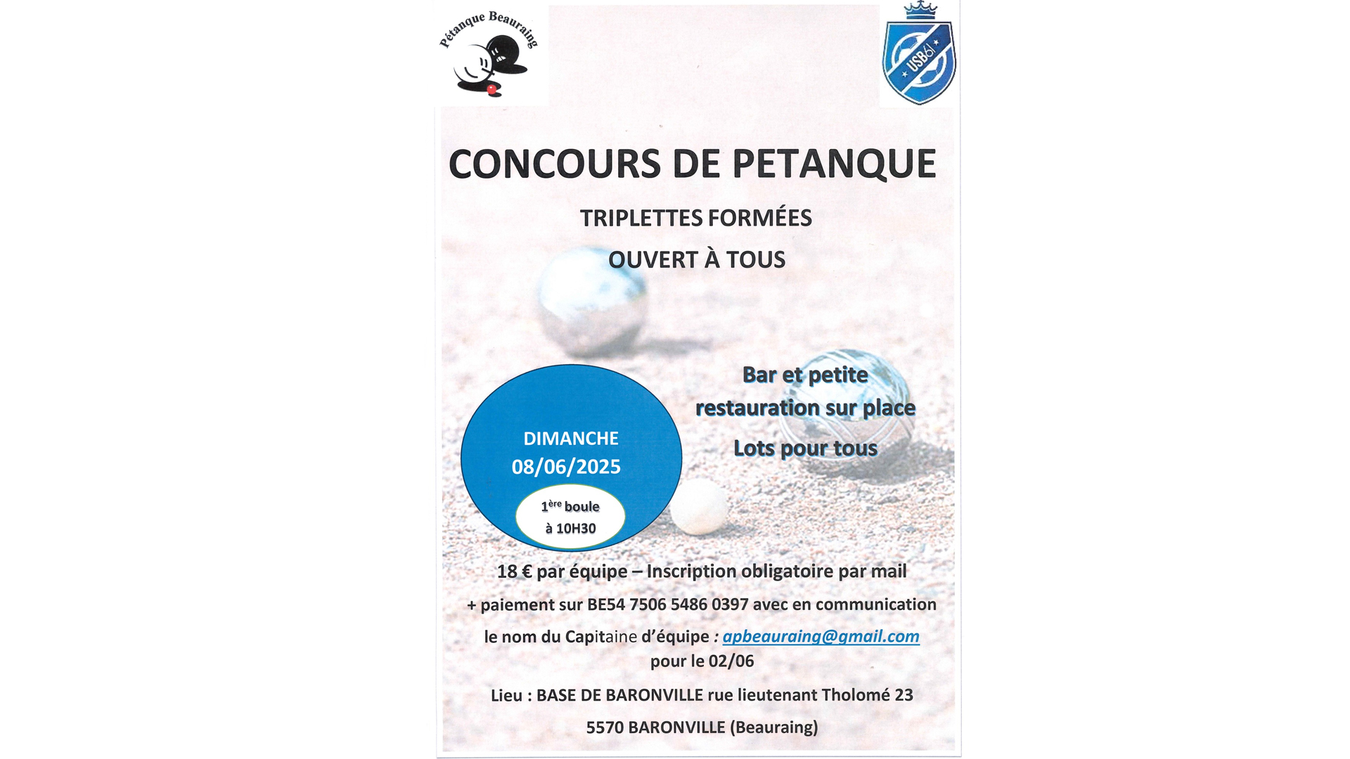 L’US Beauraing vous invite à son concours de pétanque, le dimanche 08 juin.