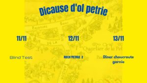 Le Quartier de la Pétrie à Beauraing organisera sa « Dicause d’ol Pétrie » du vendredi 11 novembre au dimanche 13 novembre 2022.