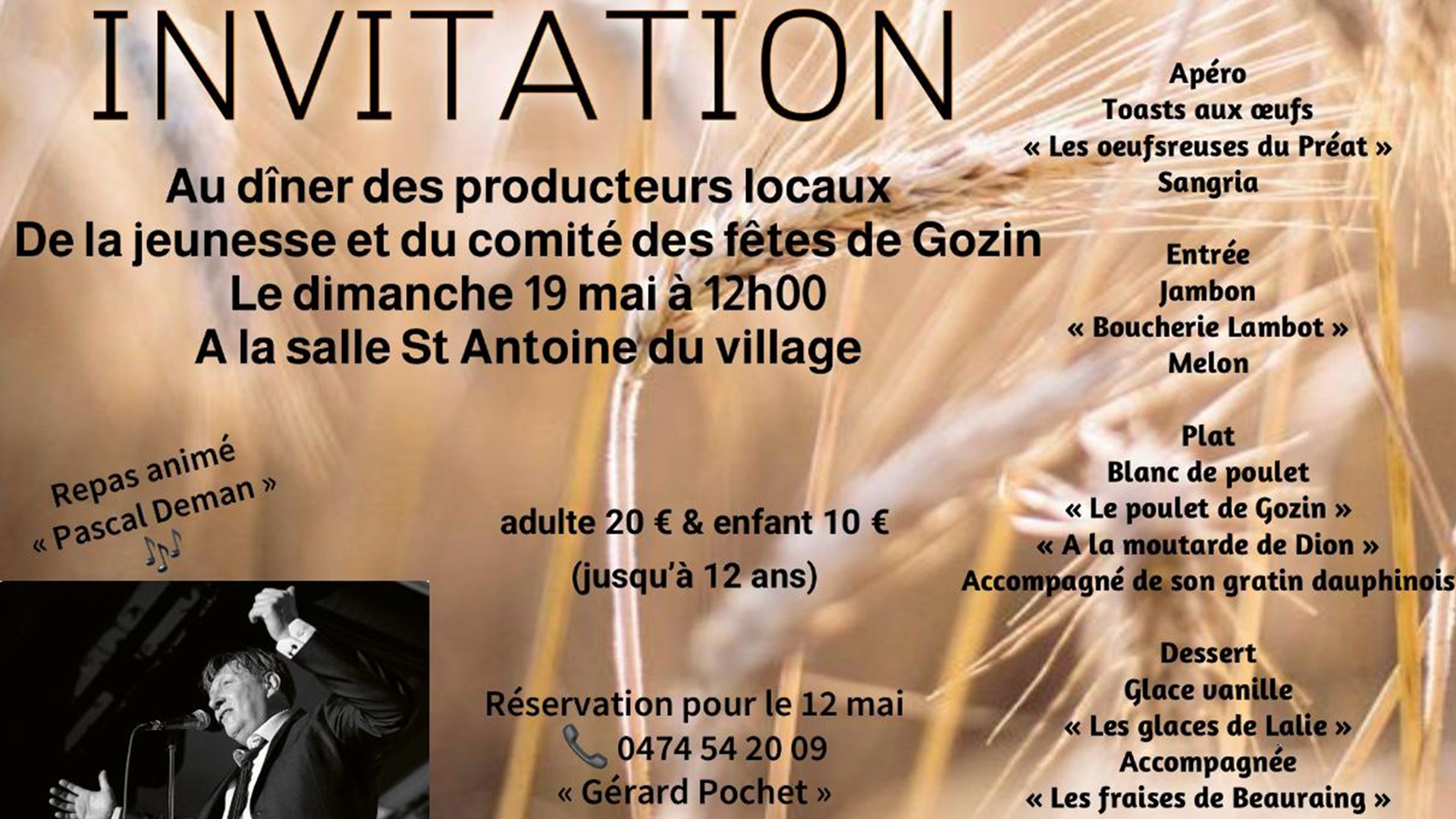 Dîner des producteurs locaux de Beauraing organisé par la jeunesse et le comité des fêtes de Gozin le 19/05. Réservation pour le 12/05.