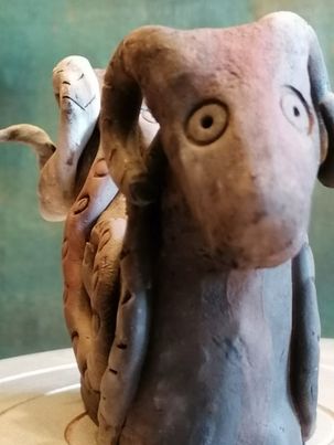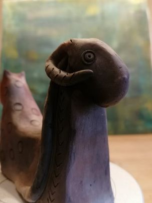 J’ai découvert qu’à cette époque, on a retrouvé des chenets miniatures (entre 6 et 10 cm) dans des tombes. Je n’ai pas trouvé d’explication à ce rite si particulier et fascinant. J’en ai donc refait des dizaines, en respectant les techniques celtes et notamment, les cuissons au feu de bois, les tailles et les motifs. Cependant, j’ai débordé en représentant d’autres animaux, en morfiant les motifs, et chantant les échelles.