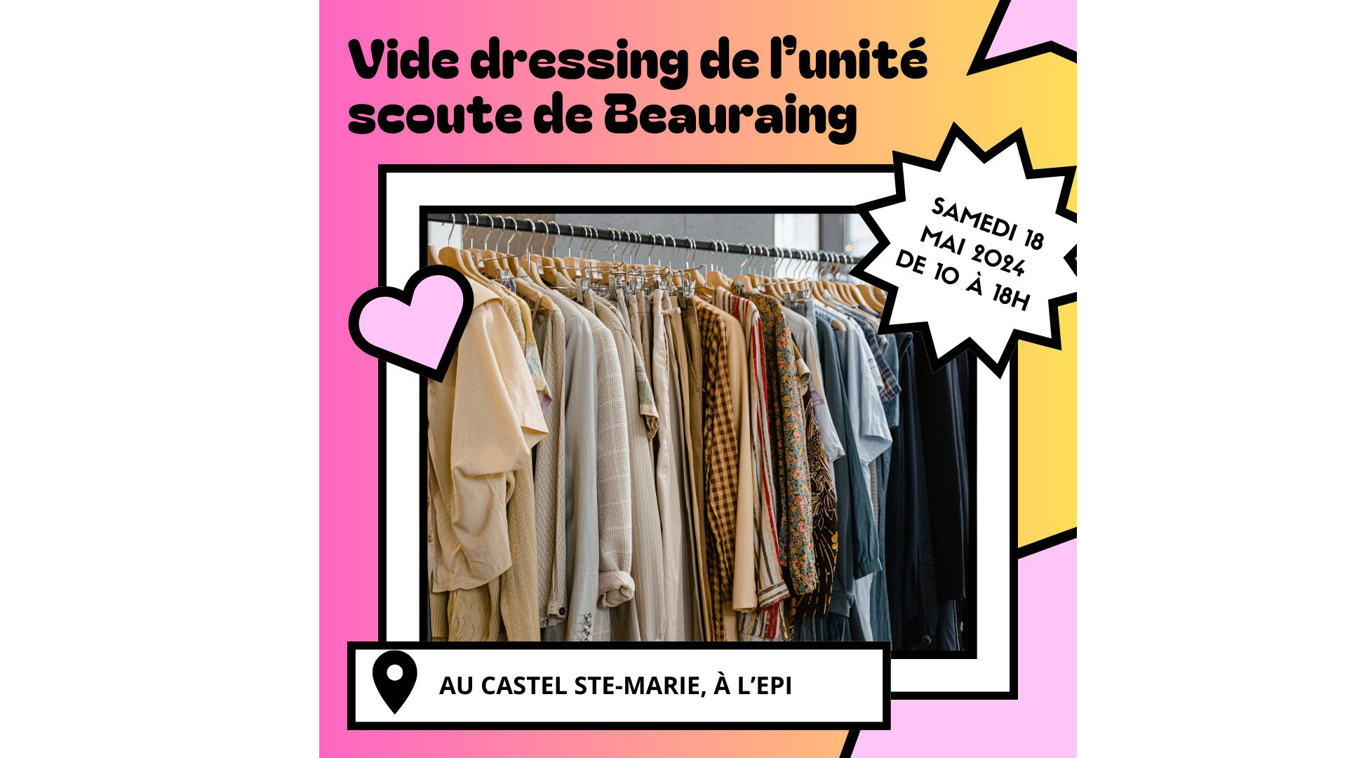 Les scouts de Beauraing organise un vide dressing ce samedi 18 mai 2024 au Castel Ste Marie au profit de la rénovation de l’Epi.