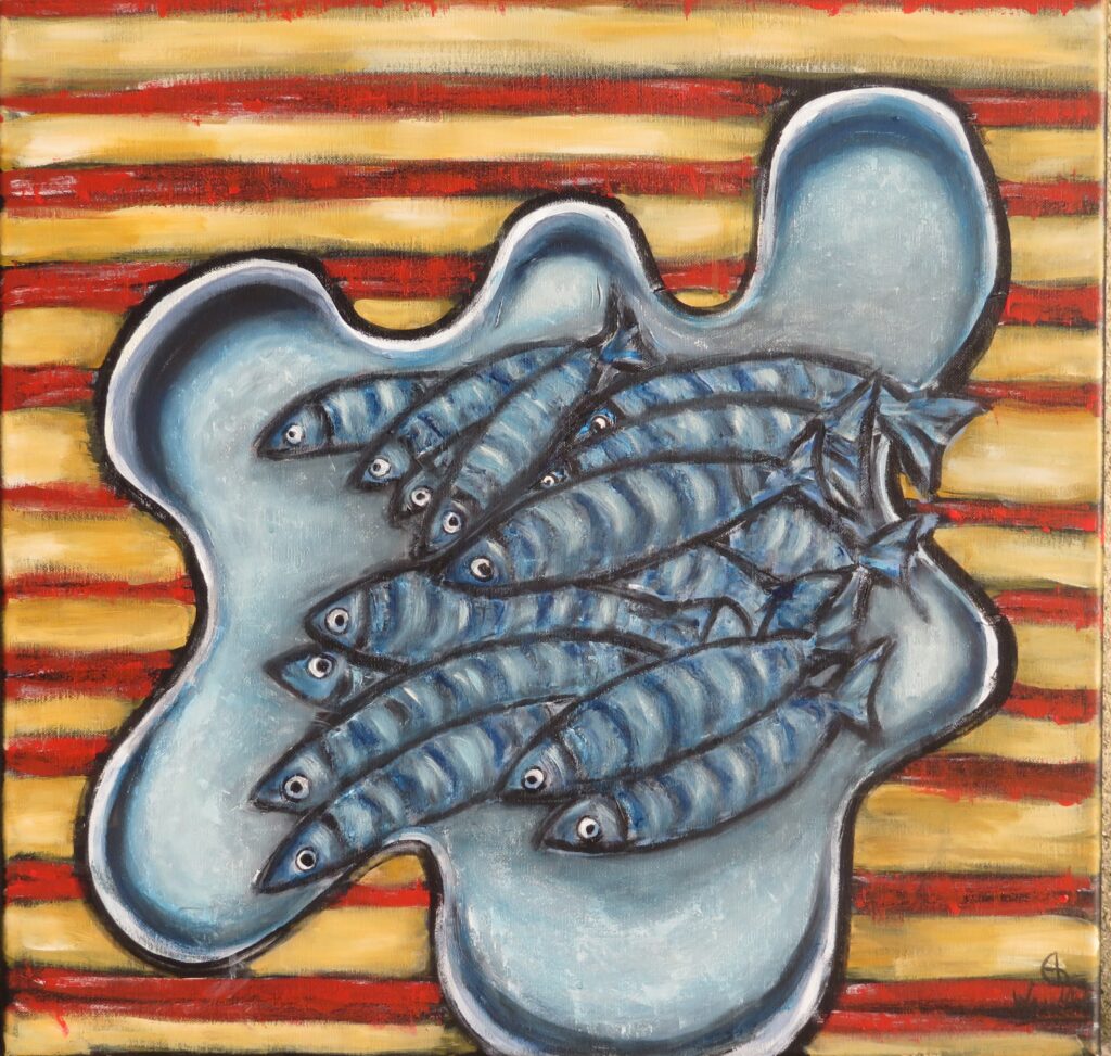 Autodidact, van vallen en opstaan tot kleine vondsten, de doeken zijn bedekt met verf, een eerder expressionistische stijl, vals naïef. Ik denk aan verschillende registers: het zelfportret en de schapen die een persoonlijk en intiem karakter hebben; het Alledaagse: de zee, de vissen, de koeien, de natuur.