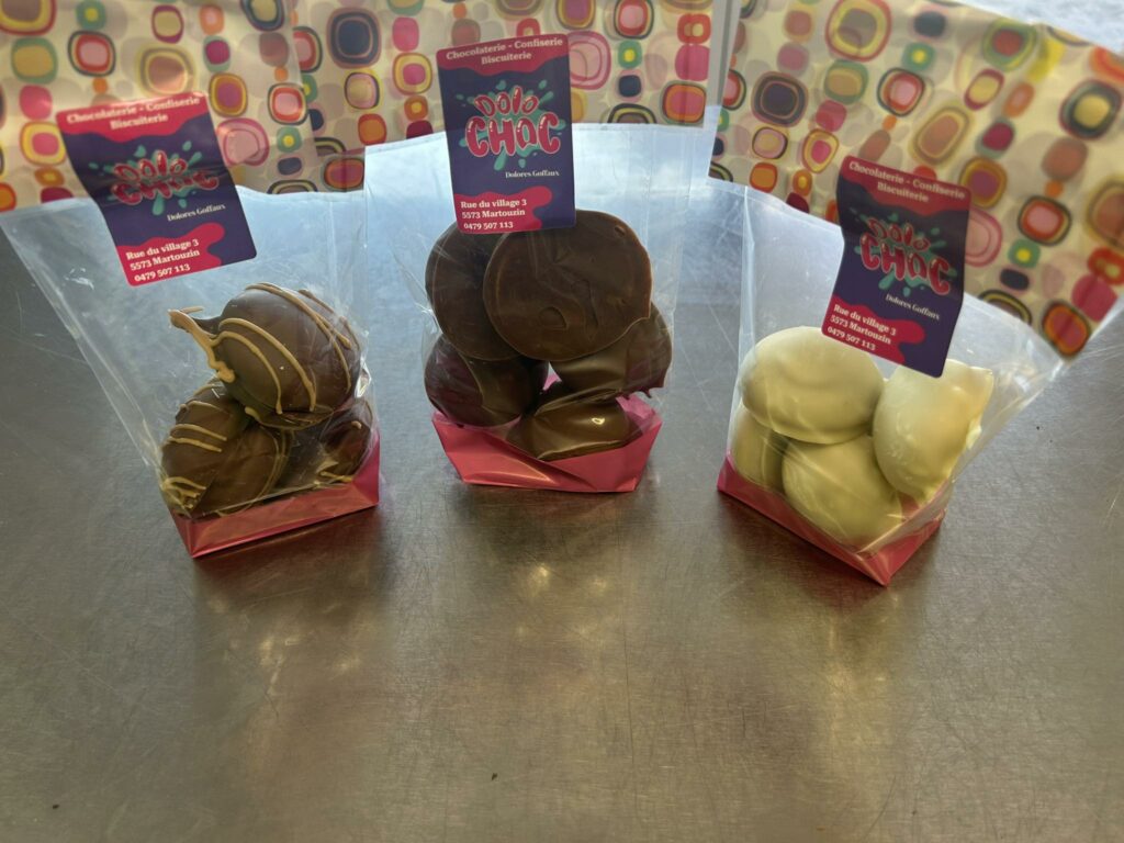 Dolores Goffaux, ancienne couturière devenue enseignante en hôtellerie spécialisée, s’est passionnée pour la chocolaterie après un parcours professionnel riche et des formations continues variées. Installée à Martouzin, elle confectionne ses chocolats avec des produits frais et sans conservateurs. Son savoir-faire couvre également la confiserie, la biscuiterie, la pâtisserie, avec une grande rigueur acquise au fil de ses formations en hôtellerie-restauration, bistronomie et chocolaterie.